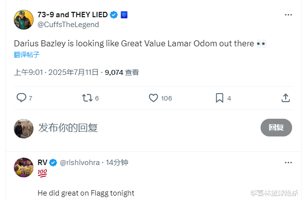 贝兹利的表现在推特上也引发了热议,不少人称赞他限制了独行侠的状元弗拉格。其中一位叫拉尔夫·梅森的网友表示:“弗拉格的第一场比赛,一点也不担心他的投篮,话虽如此,达柳斯·贝兹利在防守端的表现非常出色,而且到目前为止,他在夏季联赛中每场比赛都表现出色。”也有网友建议湖人留下贝兹利。